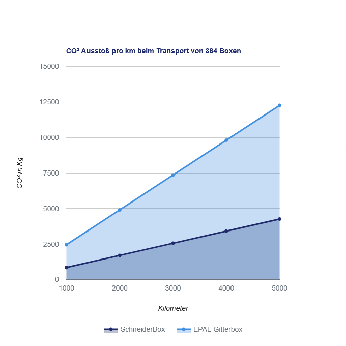 2) Die angegebenen Verbrauchs- und Emissionswerte beziehen sich auf eine Erhebung des CO²-Ausstoßes pro gefahrenen LKW-Km des Bundesumweltamtes aus dem Jahre 2019. Ein mit 96 leeren EPAL Gitterboxen beladener Megatrailer hat ein Gesamtgewicht von ca. 22 t. und verursacht pro gefahrenen Kilometer einen CO²-Ausstoß von 613 gramm. Um 384 leere EPAL Gitterboxen zu transportieren, werden 4 Fahrten benötigt, sodass sich der CO²-Ausstoß pro Km auf 2.452 gramm vervierfacht. Im Vergleich ist für den Transport von 384 leeren SchneiderBoxen nur eine Fahrt nötig. Der mit 384 SchneiderBoxen beladene Megatrailer hat ein Gesamtgewicht von ca. 40 t. und verursacht pro gefahrenen Kilometer einen CO²-Ausstoß von 852 gramm. Der Transport von 384 leeren SchneiderBoxen verursacht somit 65 % weniger CO²-Ausstoß im Vergleich zum Transport von 384 leeren EPAL Gitterboxen.